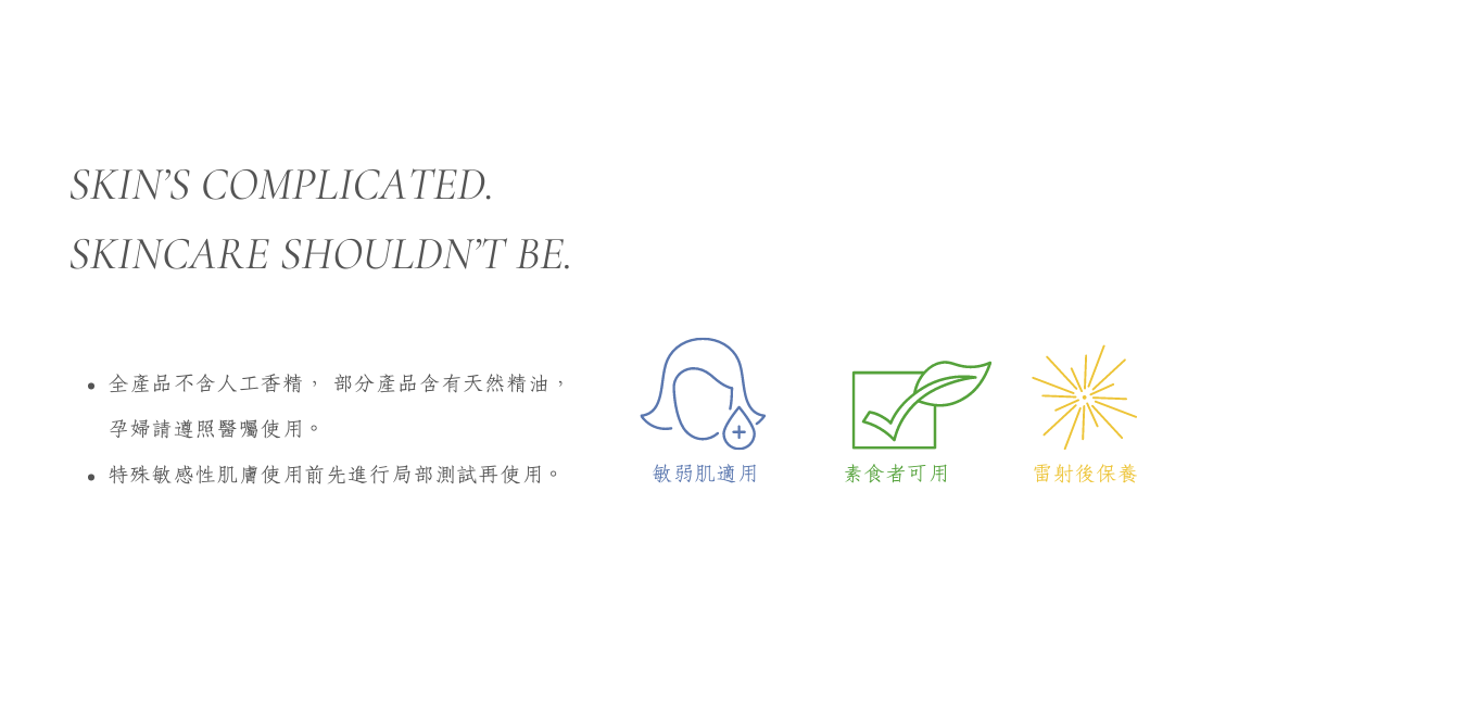 平衡油水、舒緩鎮靜、安撫敏弱肌膚。